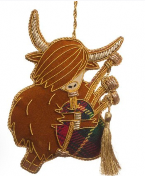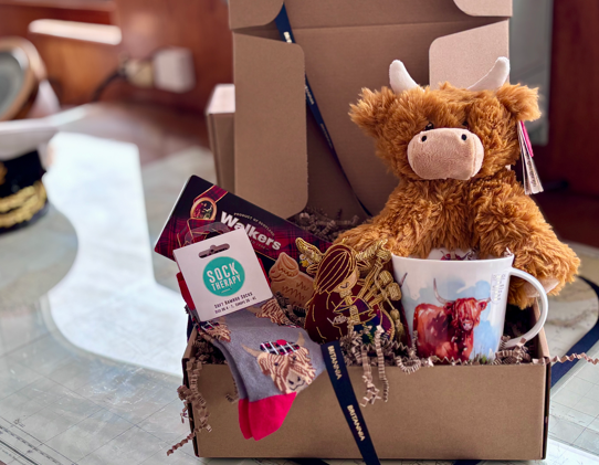 The unofficial symbol of Scotland, our Highland Cow Hamper is full of fun and is sure to delight any coo fan. Our Eco Highland Cow, made from recycled fibres, is sure to steal the show but is happy to share the pasture with Highland Cow shortbread, Highland Cow china mug, a hand-beaded Bagpiping Highland Cow decoration, and cosy bamboo Highland Cow with tam socks.